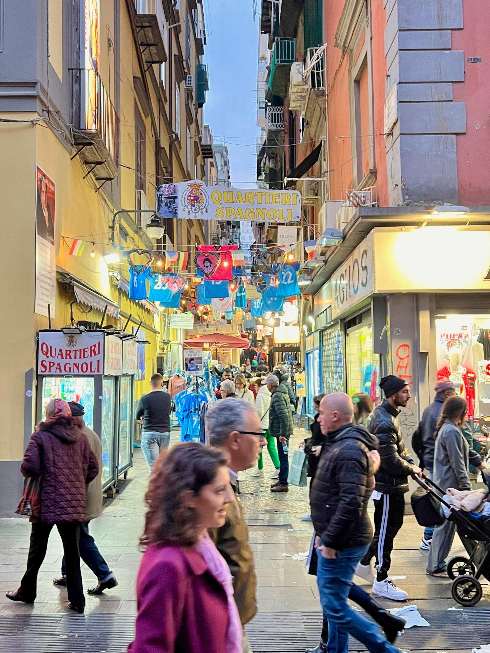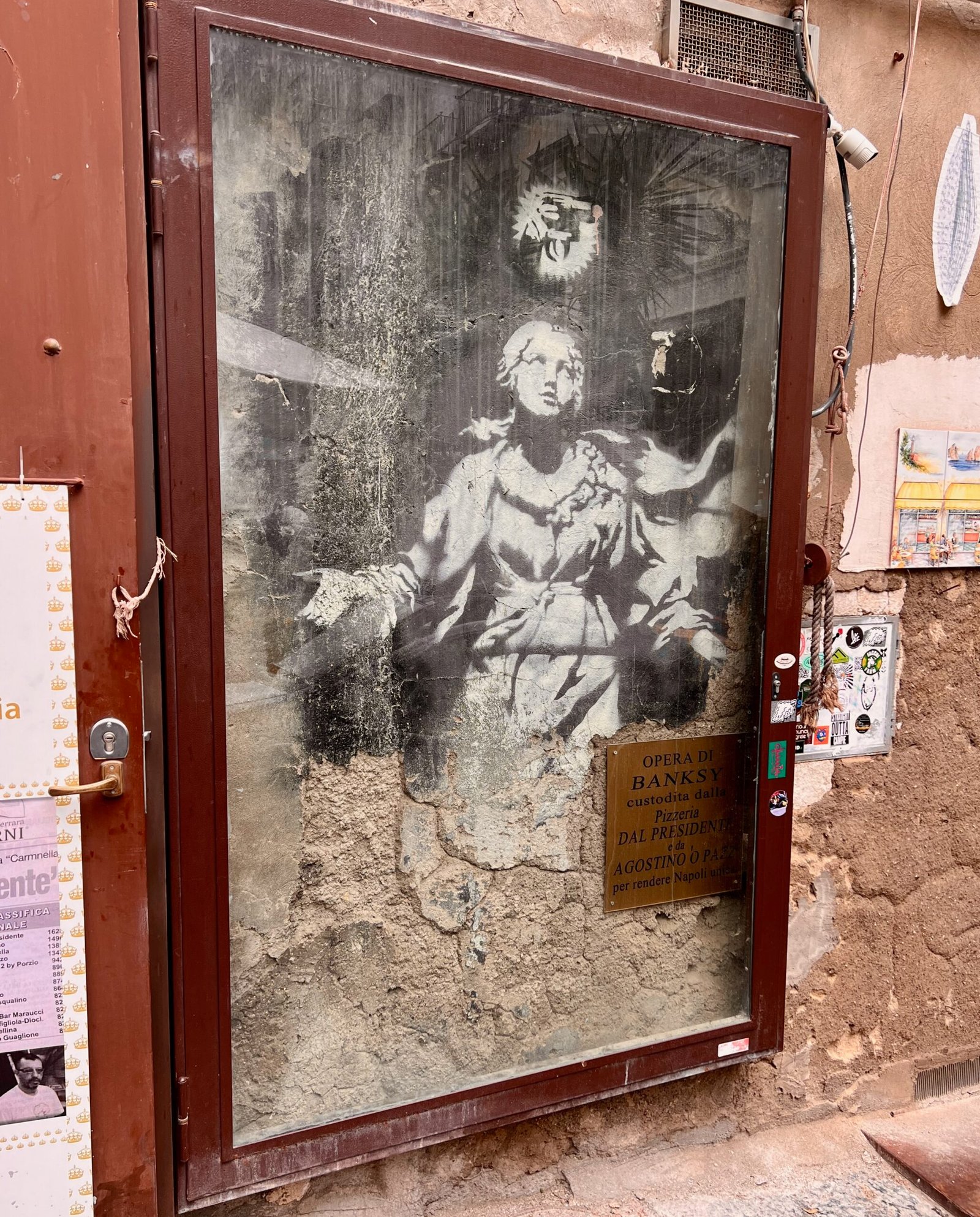 Desde la Piazza Dante, tras cruzar el arco del monumento a Vittorio Emmanuele II, se accede al centro histórico, donde reside una de las más apretadas concentraciones de hermosos edificios de todo Italia, encajados en pequeñas calles por las que discurren riadas de turistas ocupados fundamentalmente en no ser atropellados por las Vespas que pasan a toda velocidad esquivándoles, como si fuera una competición de a ver quién se arrima más. Es como una corrida de toros pero al revés. Cuanto antes te hagas a la idea de no tienes nada que hacer al respecto y de que tu suerte está en sus manos, mejor. Como te decía hay un montón de sitios para ver en el centro histórico, algunas de cuyas calles se remontan al origen griego de Nápoles y son de las más antiguas del Mundo. No deberías dejar de ver: Basílica de San Lorenzo Maggiore, Santa Maria di Costantinopoli, Santa Chiara, Palazzo delle Congregazioni y San Nicola alla Carità. Entre las muchas otras bellezas que podrás ver está un Banksy que representa una Madonna, pintado sobre una deteriorada pared, protegido por una cristalera y custodiado por una pizzeria. Igualmente sorprendente son las camisetas de Maradona representado en olor de santidad con su corona luminosa y todo, e incluso como el Corazón de Jesús. En los días que nosotros estuvimos en Nápoles el equipo de fútbol jugaba uno de los partidos finales de la Champions, así que todas las calles estaban cuajadas de cintas blancas y azules, los colores del equipo.